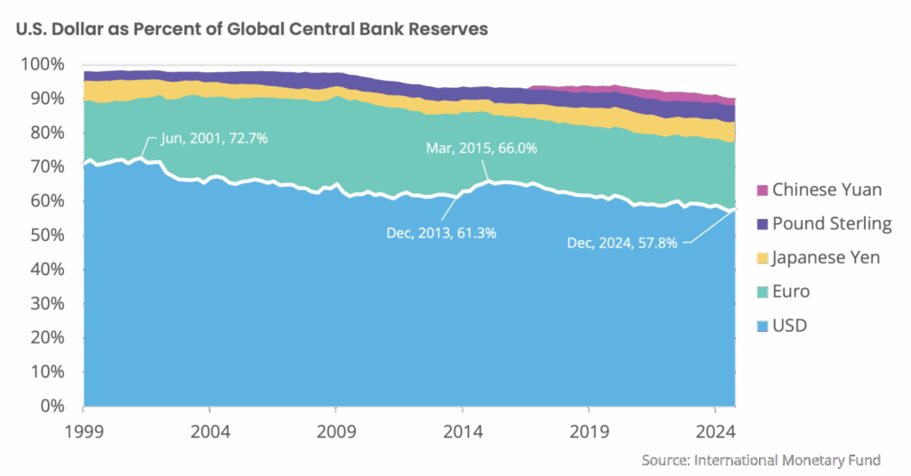 Most of the concerns about the dollar’s future as the reserve currency feels alarmist. The dollar represents about 58% of global central bank reserves, down from more than 70% in 2001, but the rate of decline is slow paced. No other currency comes close to this level of engagement. The euro accounts for less than 20% and the rest are even smaller. We wouldn’t rule out a shift in the global currency order within our lifetime, but the path looks gradual, and the dollar’s entrenched advantages remain formidable.