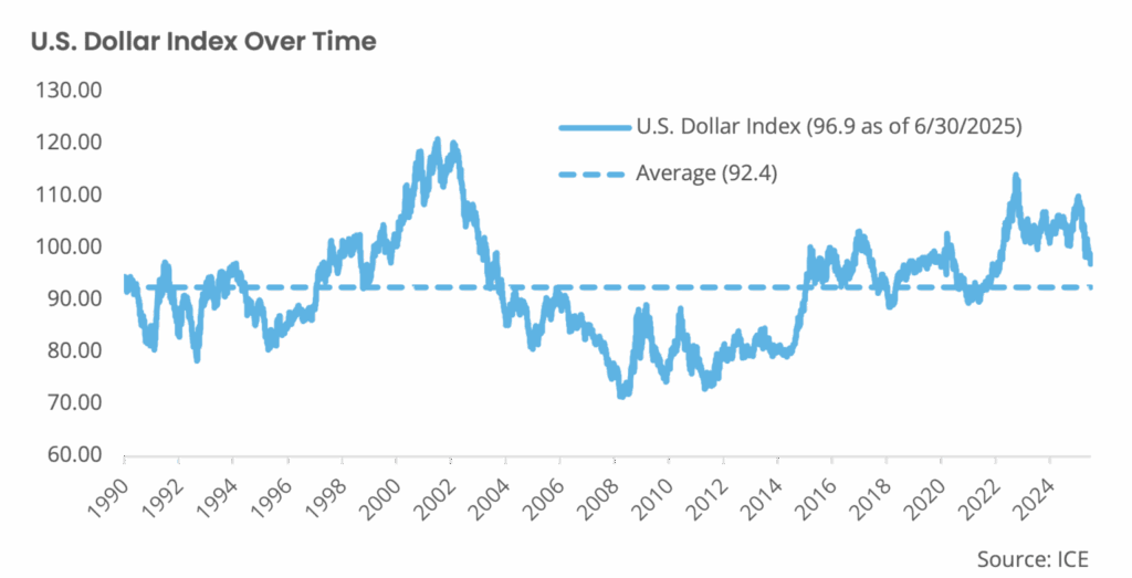History shows that exchange rates rarely follow a straight line, and even when a trend appears clear, with hindsight we see that it often reverses quickly. There are past examples of this, like when the dollar weakened throughout the early 2000s and strengthened sharply in the 2010s. It has now started to give back some of those gains. These shifts are driven less by political noise and more by relative growth expectations, interest rate differentials, and capital flows. However, there are also examples of shorter-term declines, similar to what we are experiencing this year, that have quickly reversed course. Investors should resist the urge to draw straight-line projections based on recent moves.